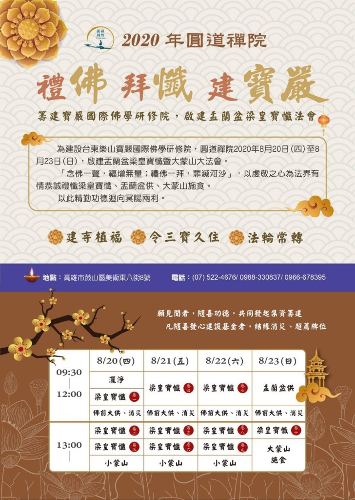 2020年8月20日(四)至8月23日(日),圓道禪院啟建盂蘭盆梁皇寶懺大法會暨小蒙山施食,募集資金將全數籌建台東知本樂山寶嚴國際佛學研修院 。