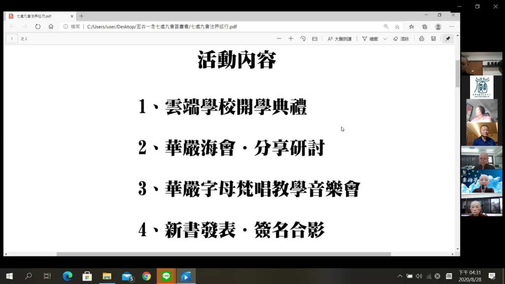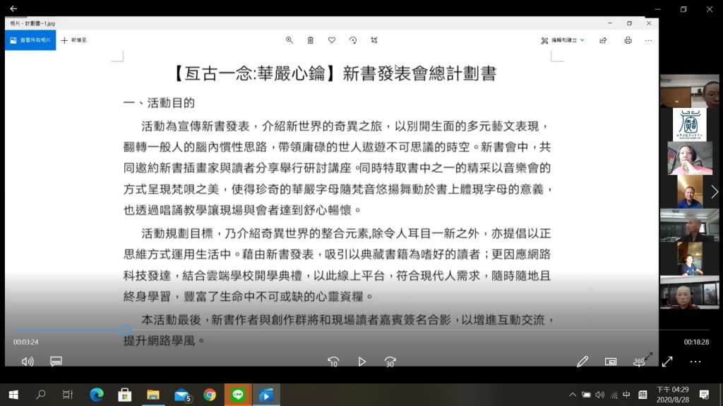 新書發表預計以華嚴經架構,採七處九會巡迴方式,結合藝術美學、音樂饗宴、科技探討、學術研究……。用鮮活多元的方式帶領大眾進入意想不到的華嚴世界。