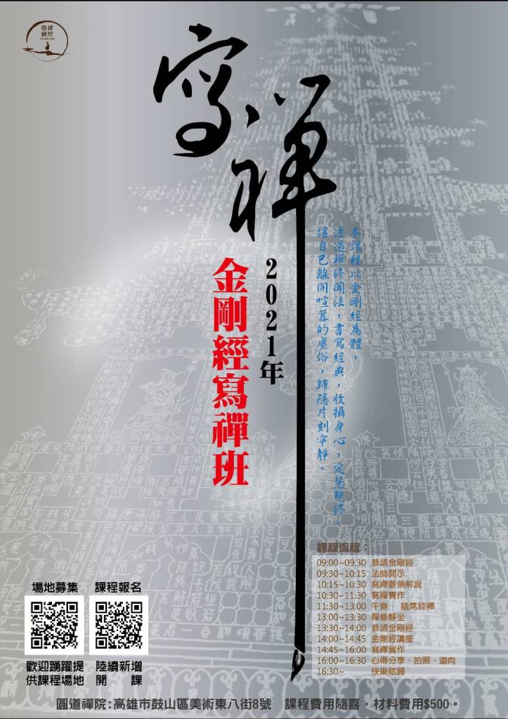 | 高雄 圓道禪院 | 高雄市鼓山區美術東八街八號 | 隔週週六 3/13, 3/27, 4/10, 4/24, 5/15, 5/29 | 0931-815373 姚卉蓁 |