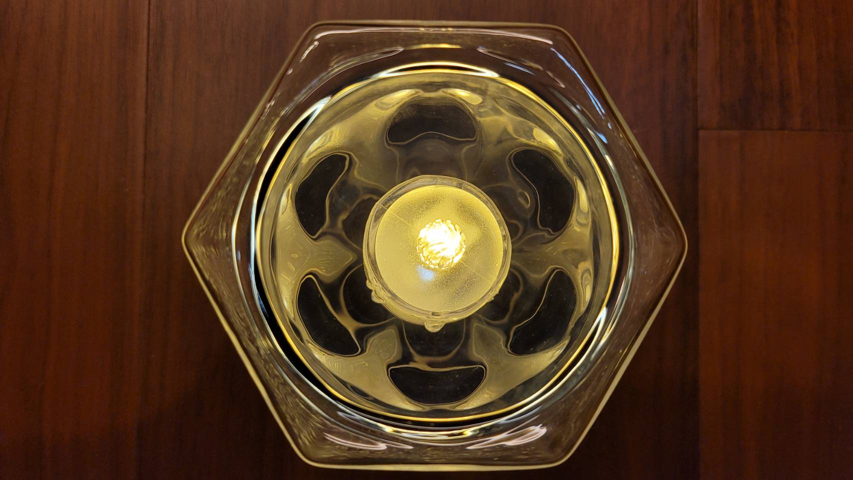 燈杯底部嵌入華嚴字母。華嚴字母是華嚴經體、相、用的音聲,聽聞華嚴字母的誦持能夠清淨我們的身、口、意三業,讓我們能夠獲得如佛圓滿的智慧,能夠發起和佛一樣的慈悲願力跟信心。