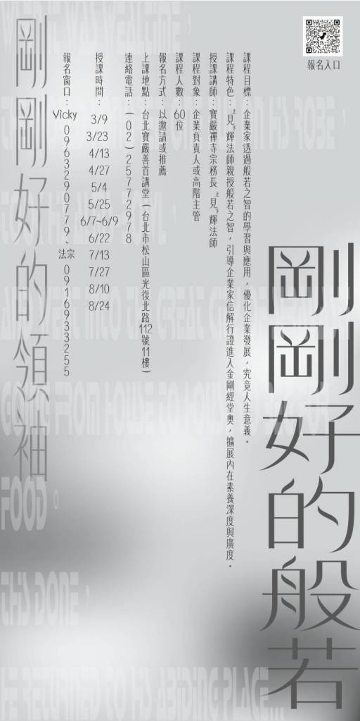 - 課程目標:企業家透過般若之智的學習與應用,優化企業發展,究竟人生意義。