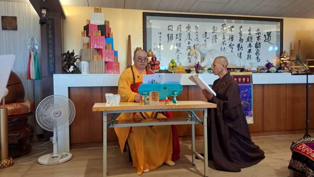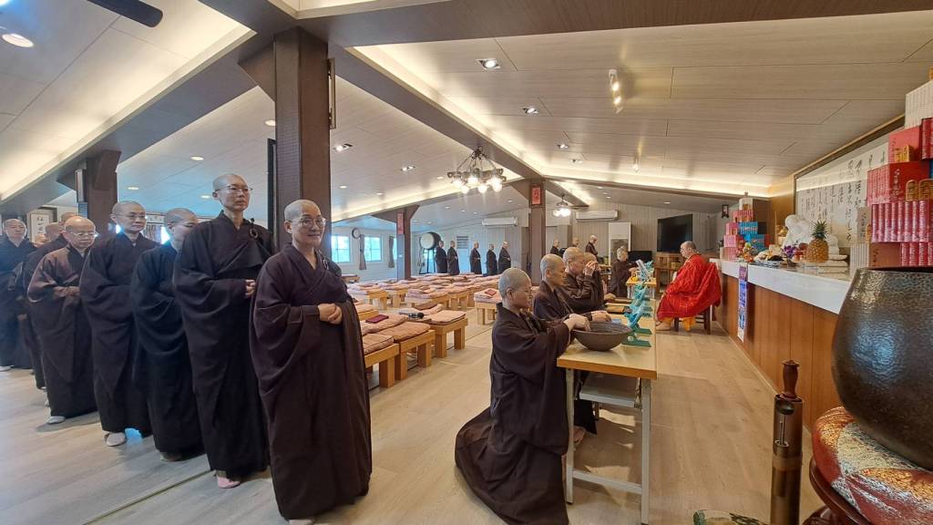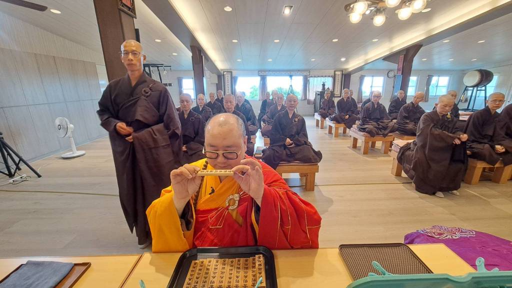 今日上午10:00舉行結夏受籌儀式,正式開啟夏安居。全體僧眾搭衣、持具,在總住持傳塵大和尚的帶領下,至誠作觀頂禮,仰祈諸佛菩薩慈悲加被,於此九旬之中,精勤辦道,無諸魔障;同祈韋馱菩薩,慈悲擁護,令眾等內無魔嬈,外障消彌。行籌儀式中更發願「具足清淨受此籌,具足清淨還此籌,堅固喜捨無缺犯,一切眾生亦如是。」以此做為辦道目標。