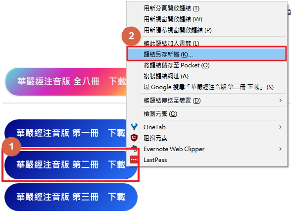 將滑鼠指標停留在按鈕上,按滑鼠右鍵,在工具選單中選擇「另存新檔」。