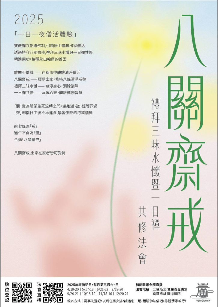 善因,自四月起,每月第三週六週日,全台寶嚴分北區、南區分院舉行傳授八關齋戒